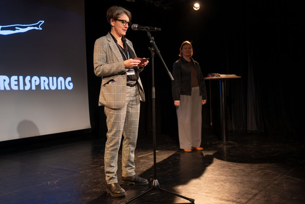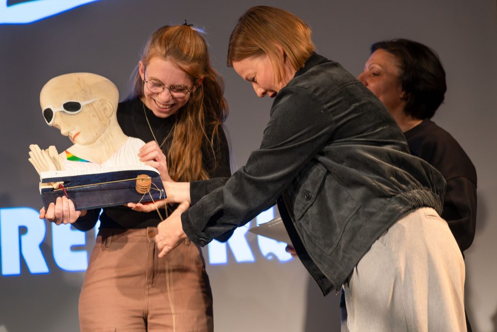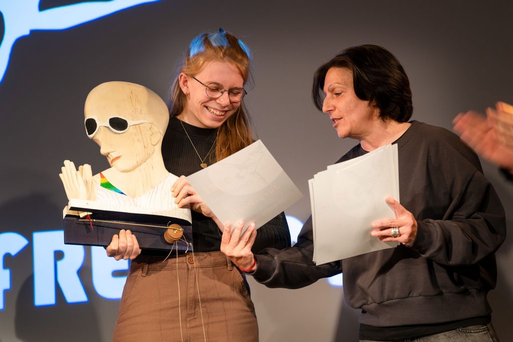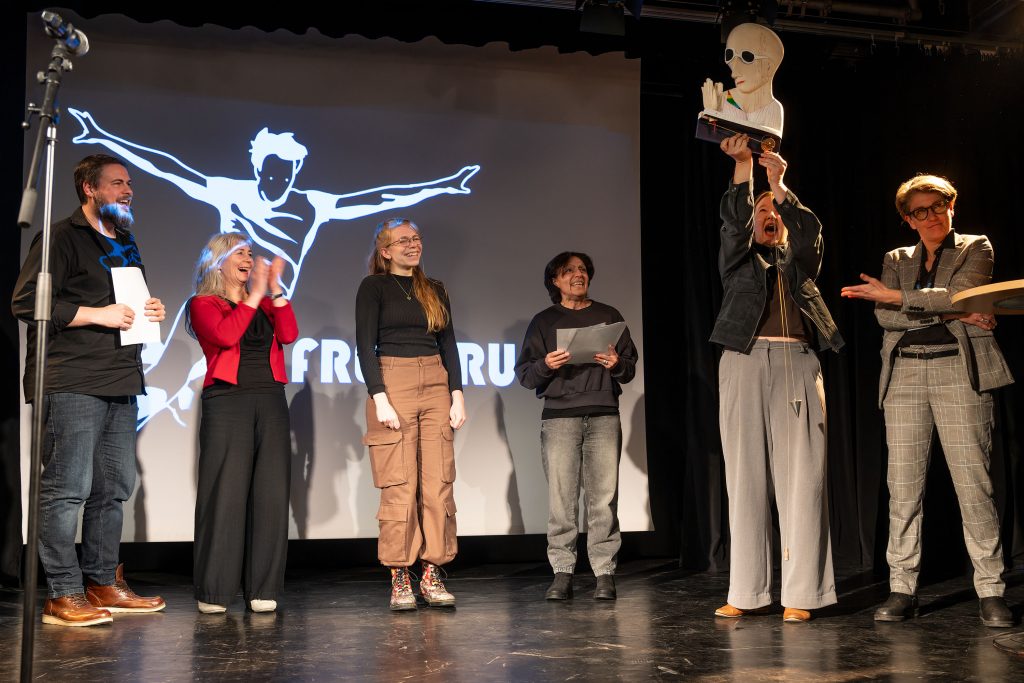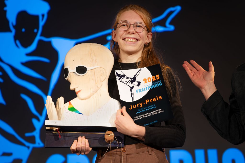 An die herausragendste Produktion wird von einer Fachjury die Skulptur „Die applaudierende Hand“ der Künstlerin Barbara Wetzel verliehen. Diese Produktion erhält außerdem ein honoriertes Gastspiel im Rahmen des SPIELLUST-Festivals in Rostock (22.-25.01.2026) und wird ein Jahr lang als Header auf der Webseite https://freisprung-theaterfestival.de/ präsentiert.